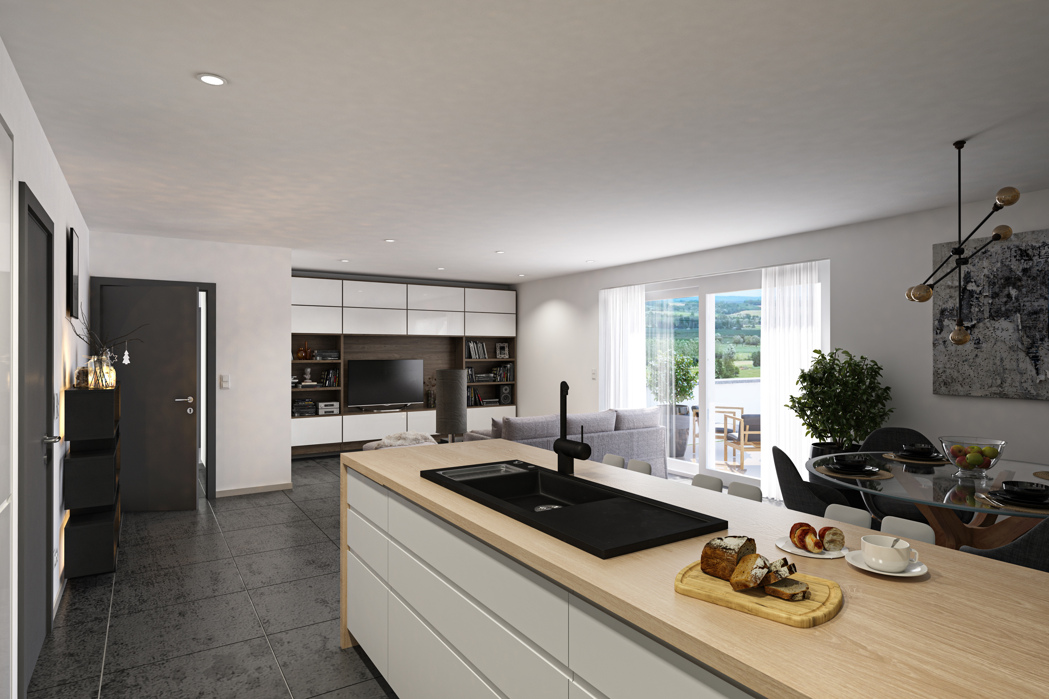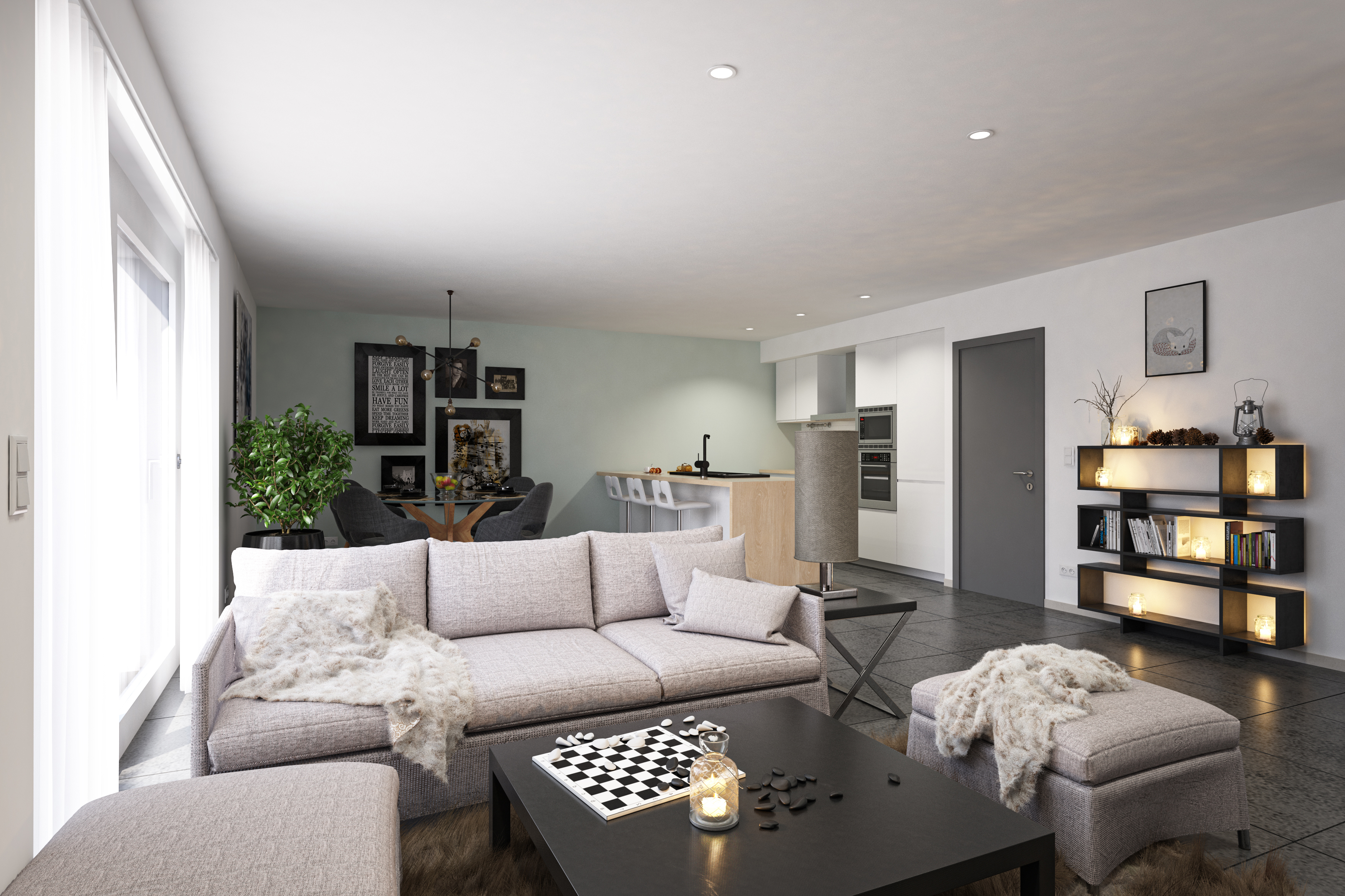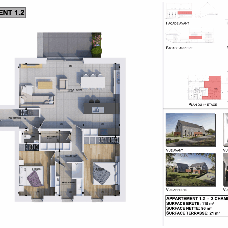 L’appartement se compose d’un hall d’entrée avec WC séparé, un grand séjour avec cuisine ouverte, 2 chambres, une salle de bain et une buanderie.