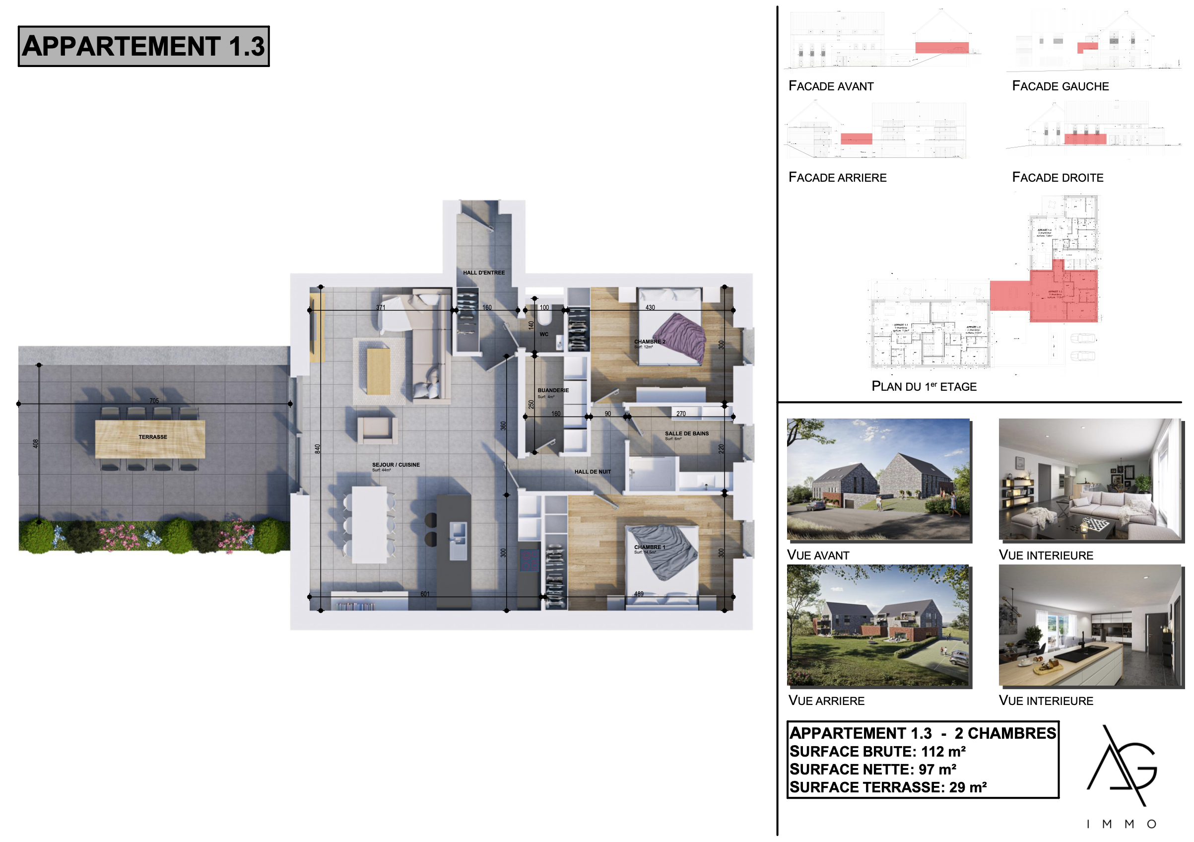 Idéalement situé, dans le village très recherché de Nandrin, superbe appartement de 2 chambres de 112 m² situé au 2ème étage de la résidence avec grande terrasse de 29 m².