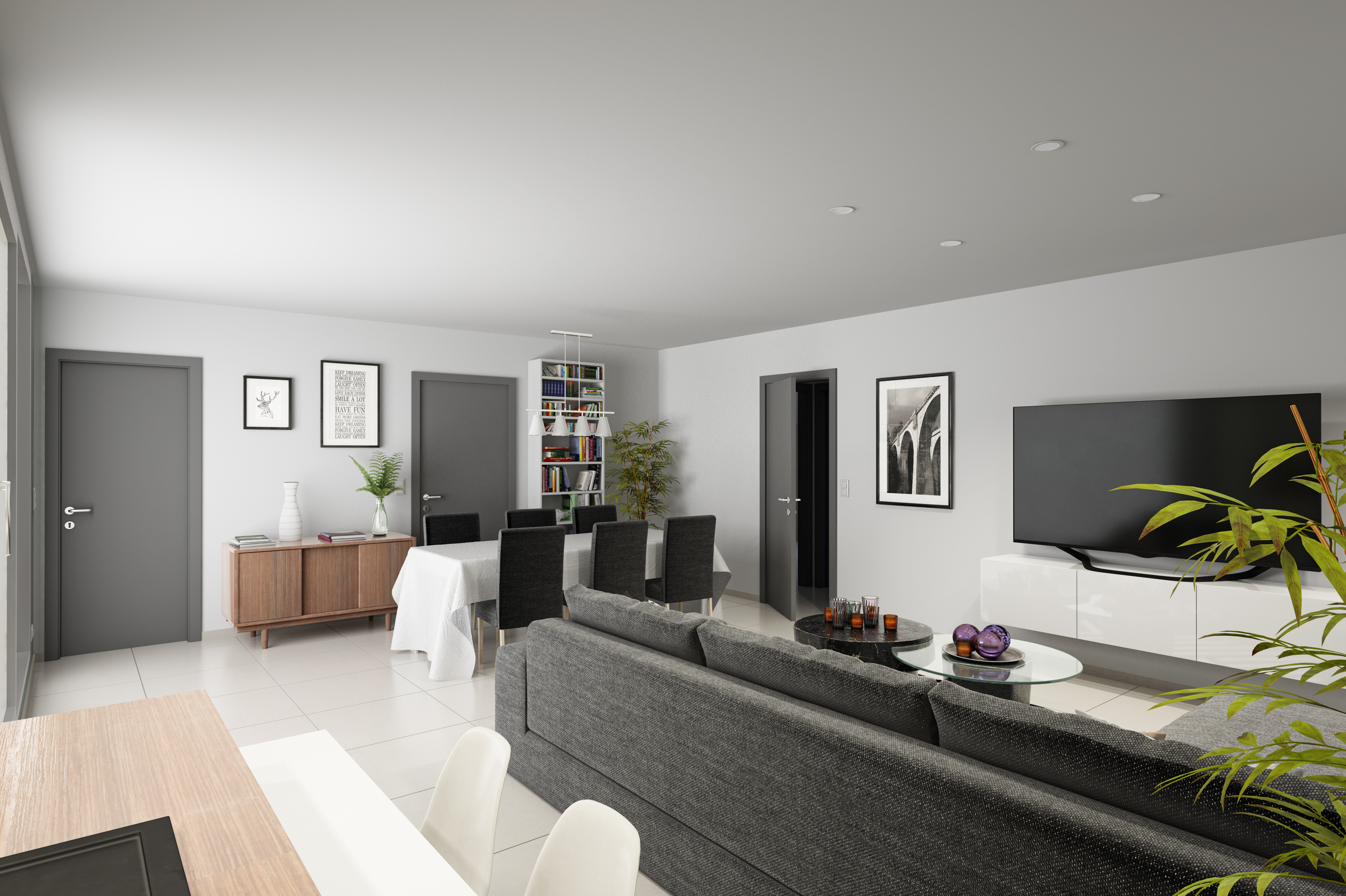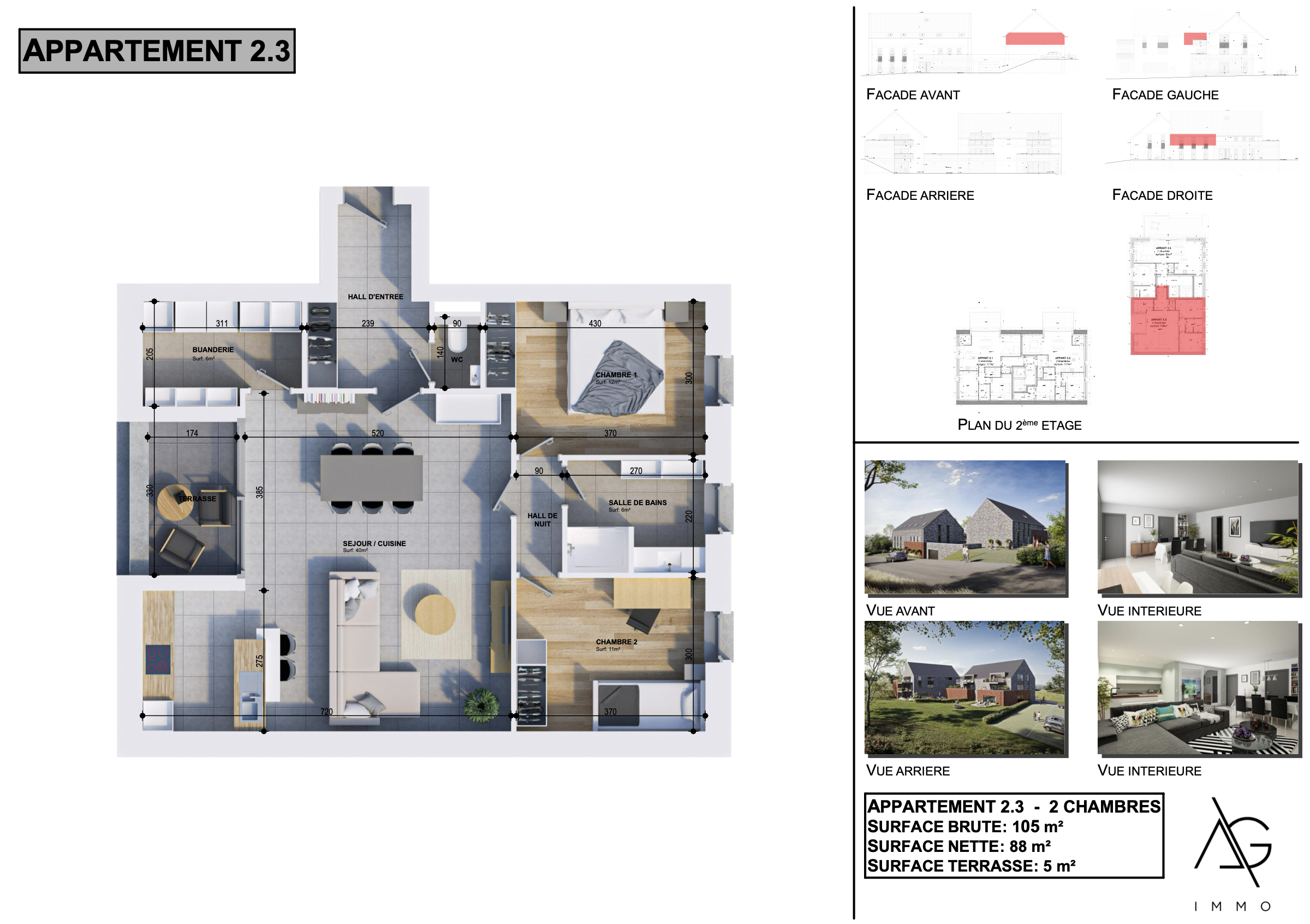 L’appartement se compose d’un hall d’entrée avec WC séparé, un grand séjour avec cuisine ouverte, 2 chambres, une salle de bain et une buanderie.