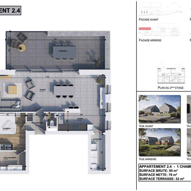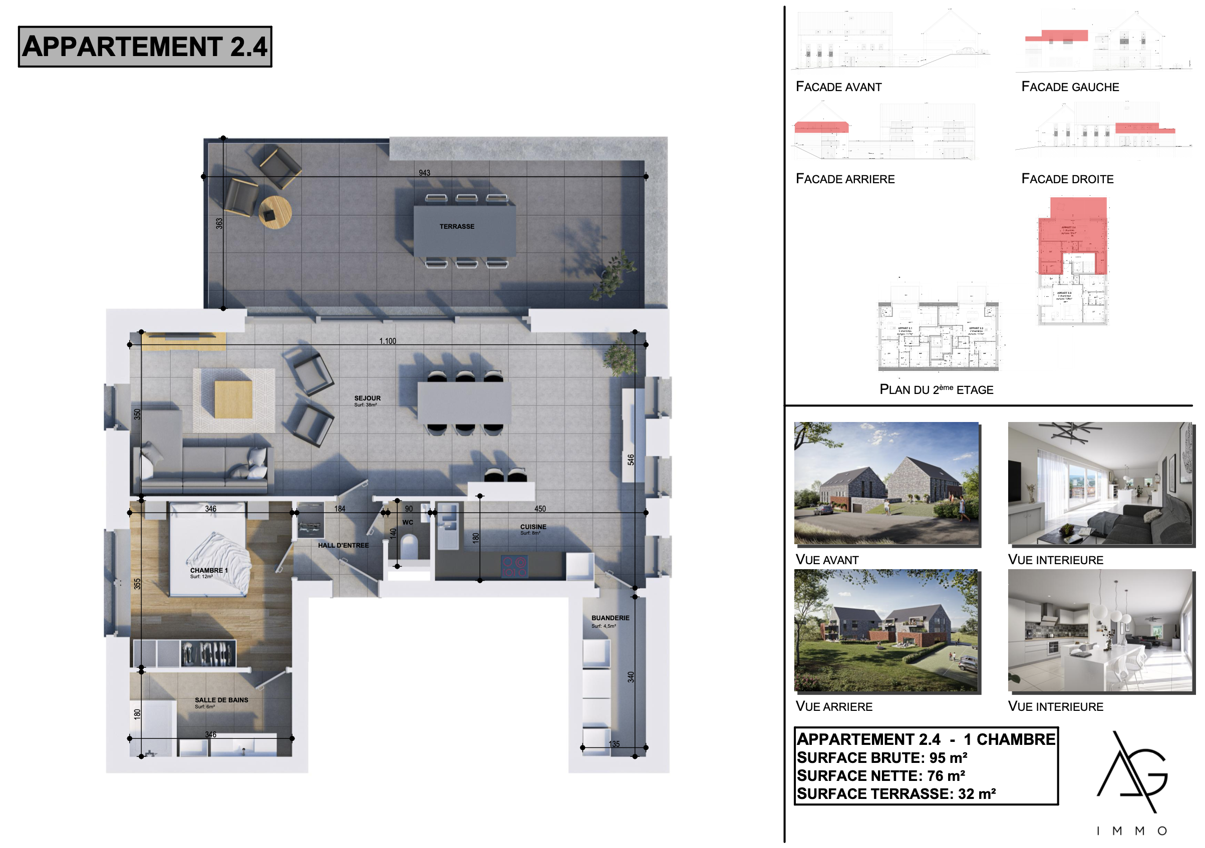 L’appartement se compose d’un hall d’entrée avec WC séparé, un grand séjour avec cuisine ouverte, 2 chambres, une salle bain et une buanderie.