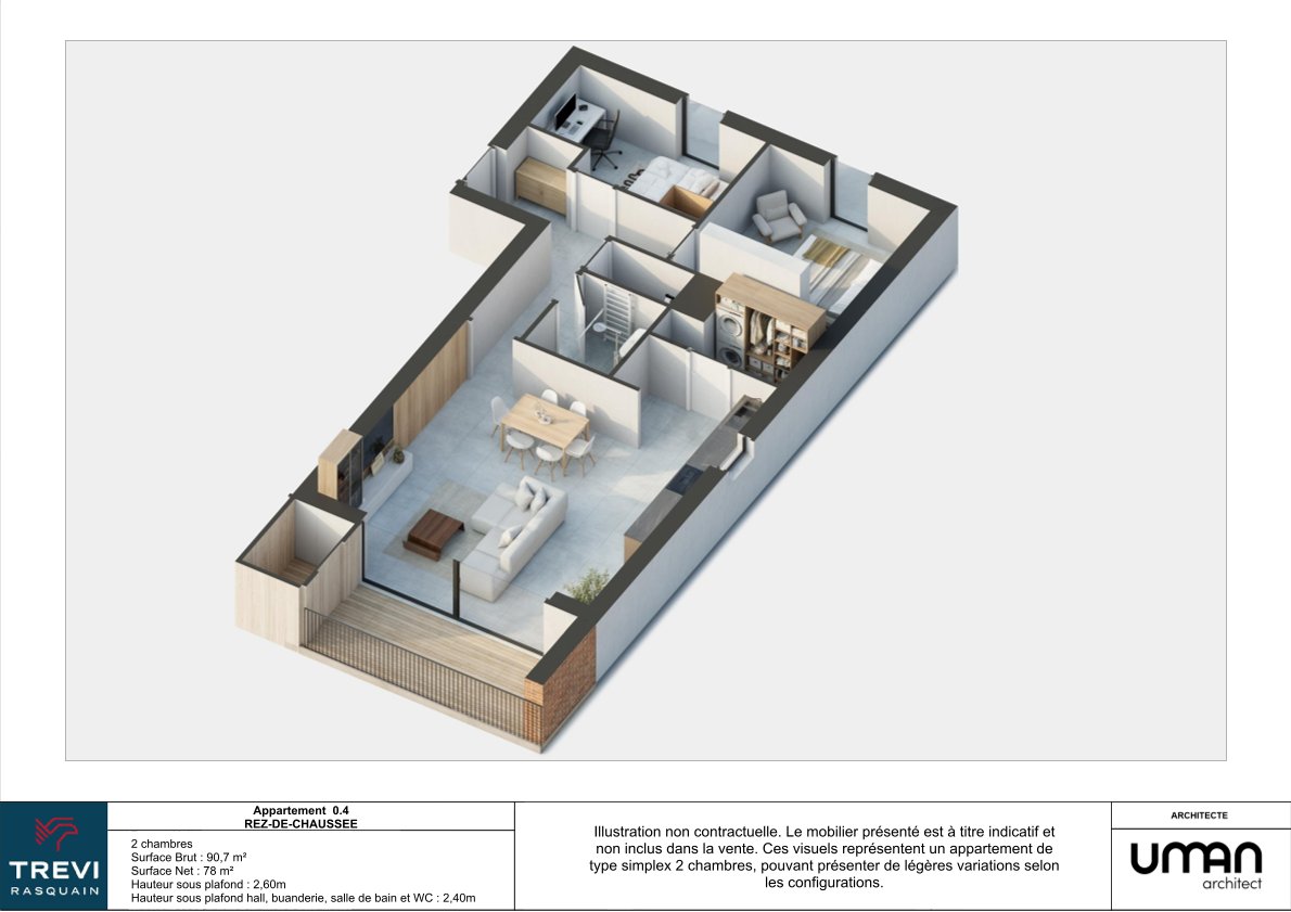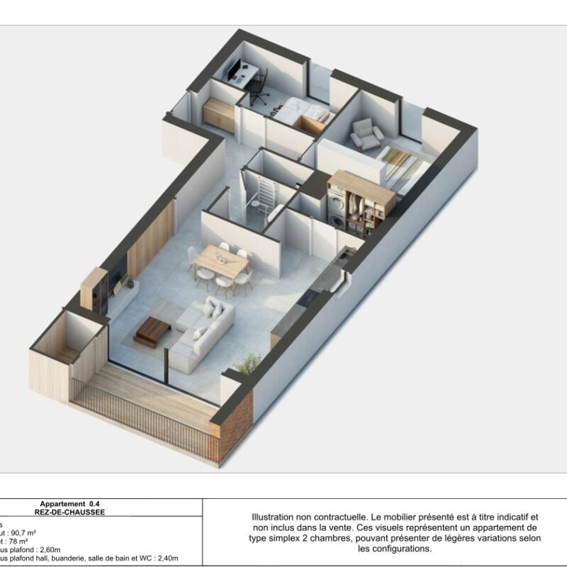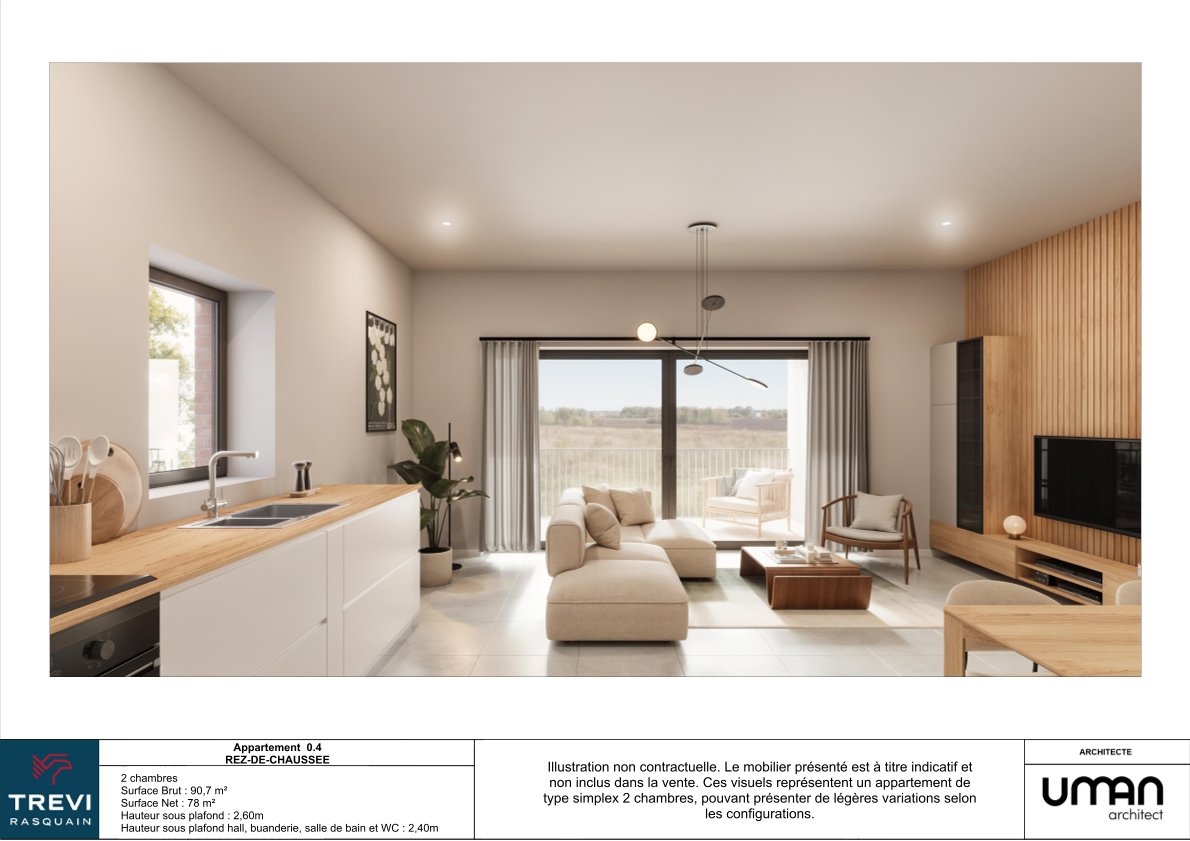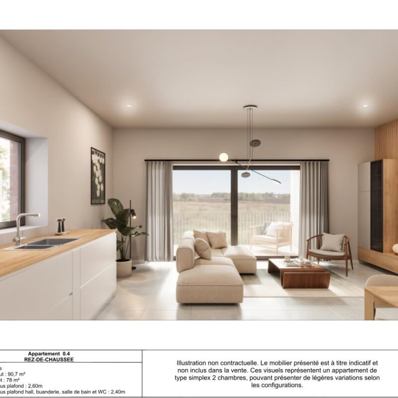 Finitions haut de gamme, ascenseur, isolation thermique et acoustique soignée. Le prix inclut cuisine équipée complète, revêtements de sol (carrelage et/ou parquet). Possibilité d’acquérir une cave (5.000€ HTVA) et un emplacement de parking privatif (7.500€ HTVA) en supplément. Paiement à la livraison (prévue 2026). Vente sous régime TVA 21%.
