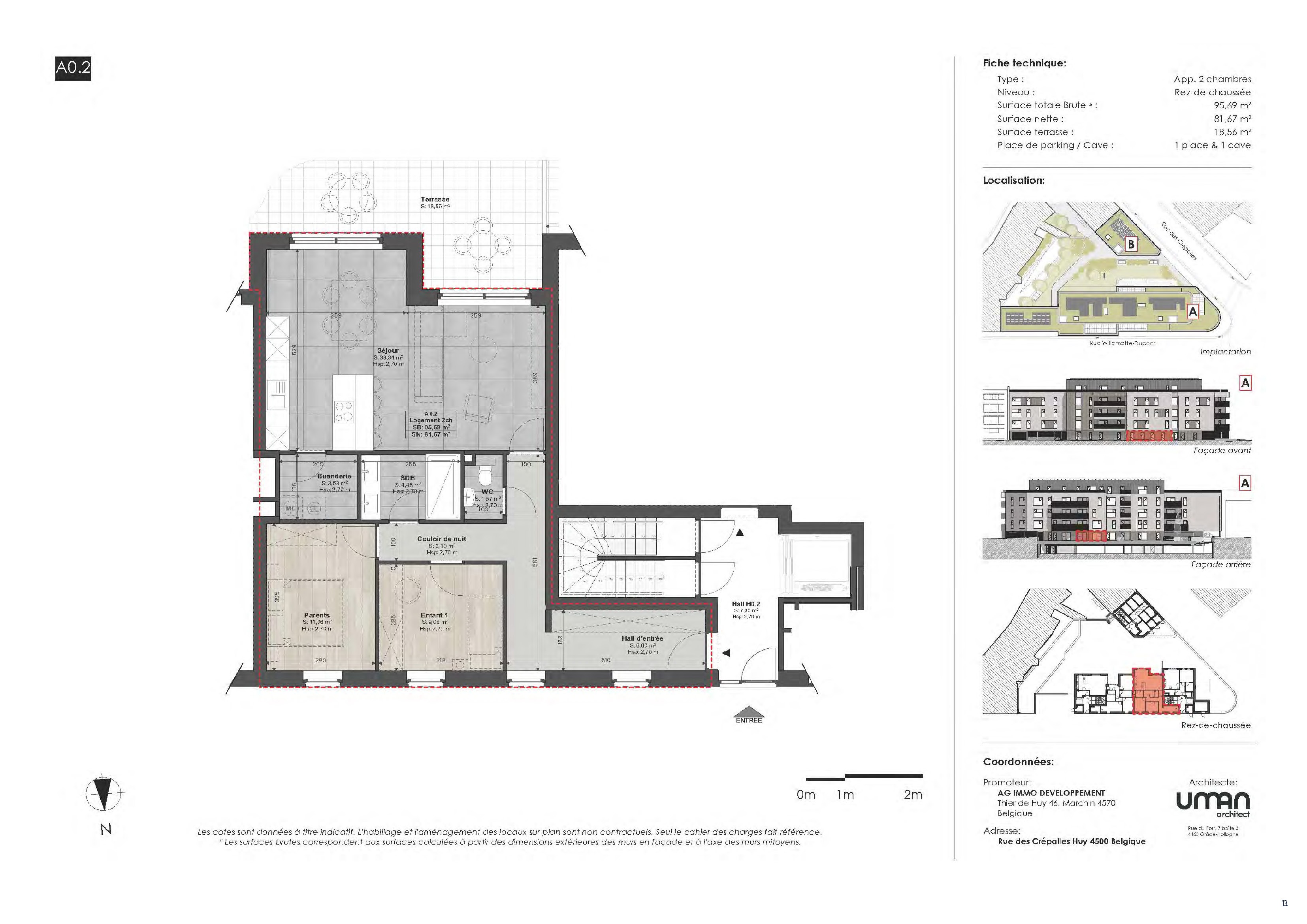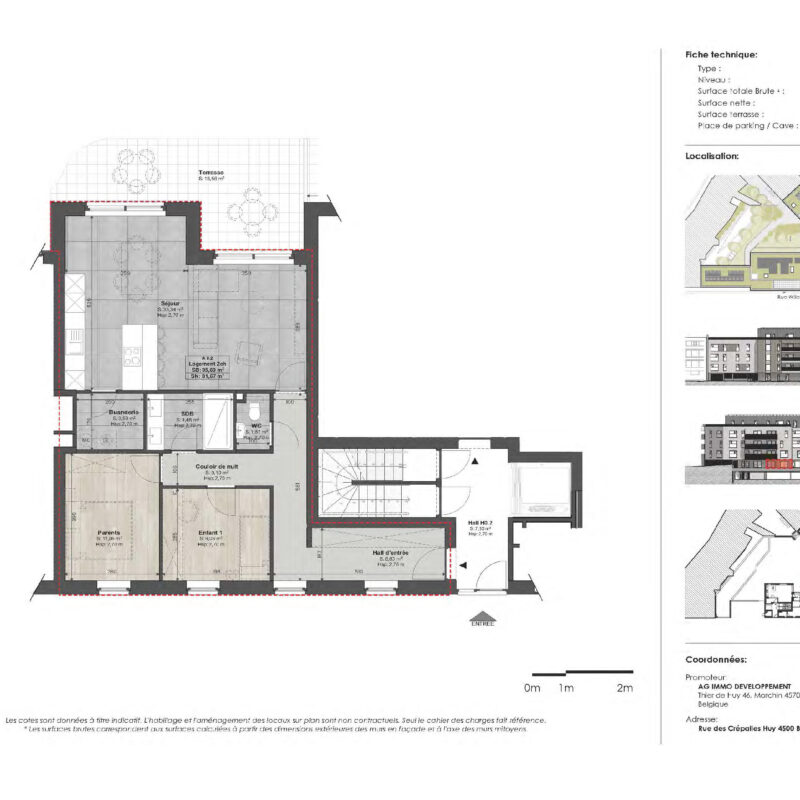 Idéalement situé au cœur de Huy, dans la Résidence des Voiles (nouvelle résidence de 23 appartements), l’appartement A0.2 est un appartement neuf de 2 chambres de 95,69 m², avec terrasse privative de 18,56 m².