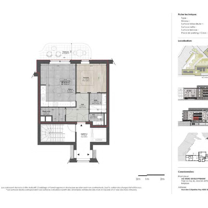 En centre-ville de Huy, dans une résidence neuve de 23 appartements, l’appartement A1.4 est un 1 chambre de 60,01 m² avec terrasse privative de 10,99 m². Un format recherché, idéal pour vivre en ville avec un extérieur, ou pour un investissement locatif dans un immeuble neuf à faible consommation.