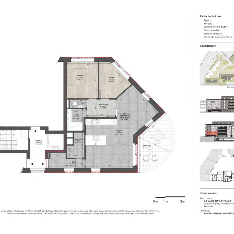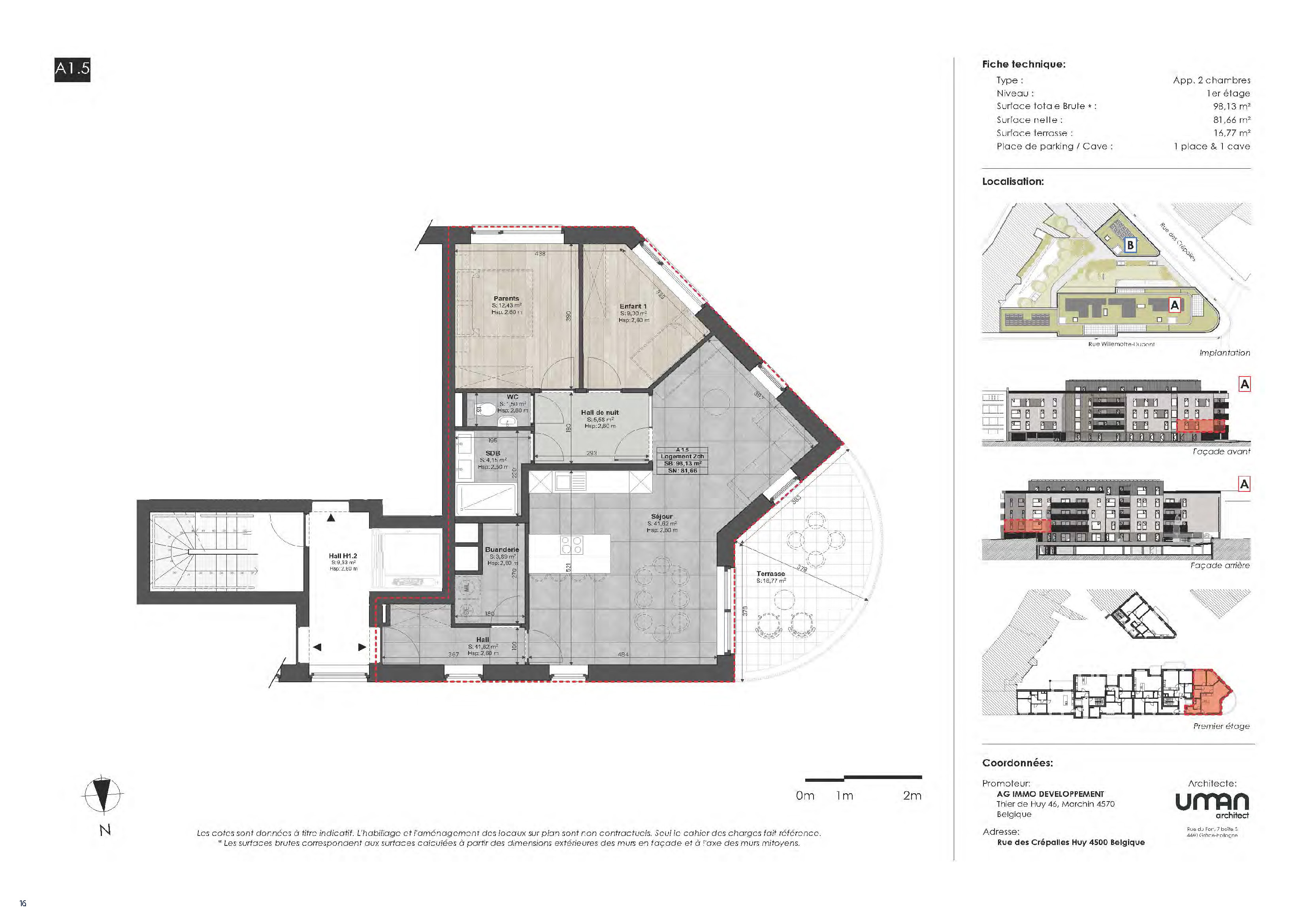 Situé au cœur de Huy, dans une résidence neuve de 23 appartements, l’appartement A1.5 propose 2 chambres, 98,13 m² habitables et une terrasse privative de 16,77 m². Un appartement agréable à vivre, avec un extérieur généreux, idéal pour profiter de la ville tout en gardant un vrai confort.