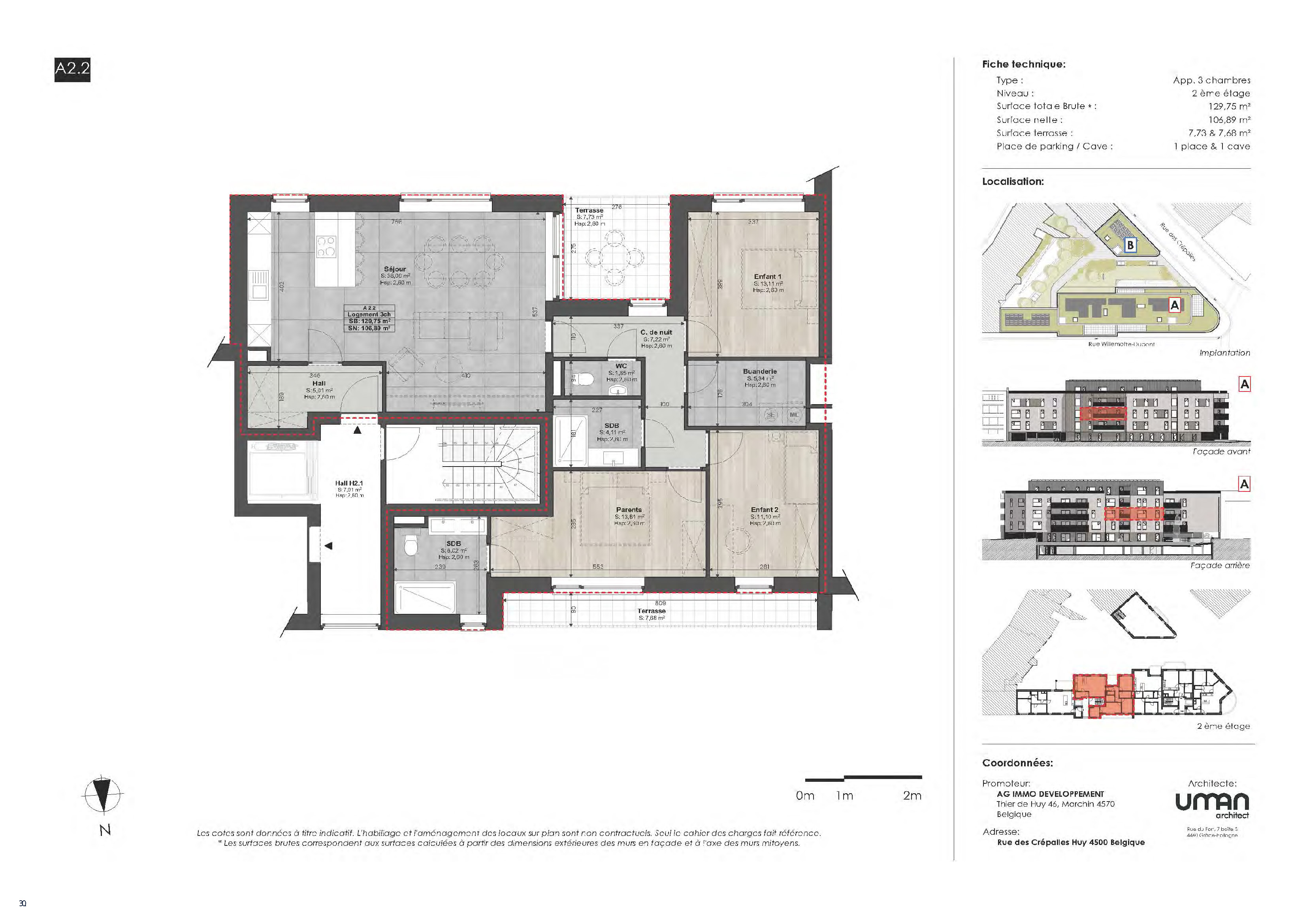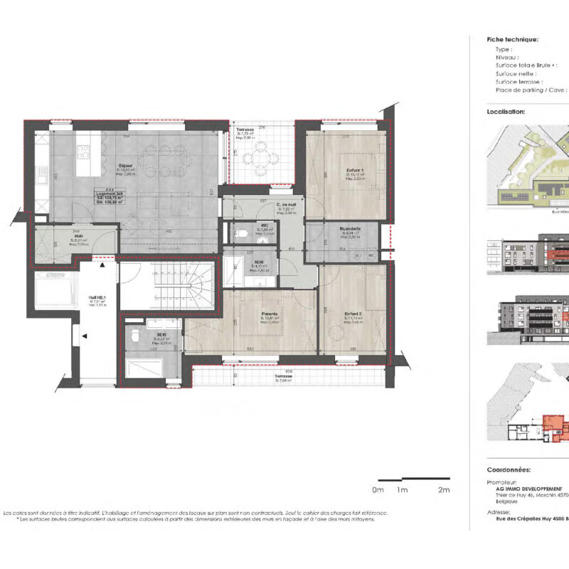 En plein cœur de Huy, dans une résidence neuve de 23 appartements, l’appartement A2.2 propose 3 chambres, 130,32 m² et une terrasse privative de 15,41 m². Une option idéale pour une famille, avec de beaux volumes, un extérieur et tout le confort d’un immeuble neuf PEB A.