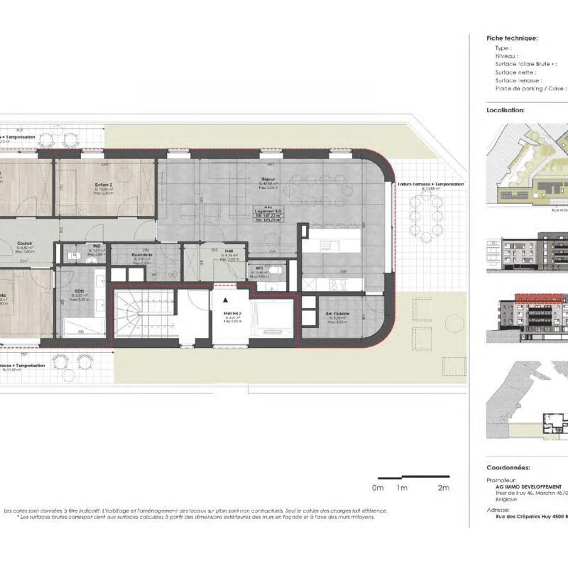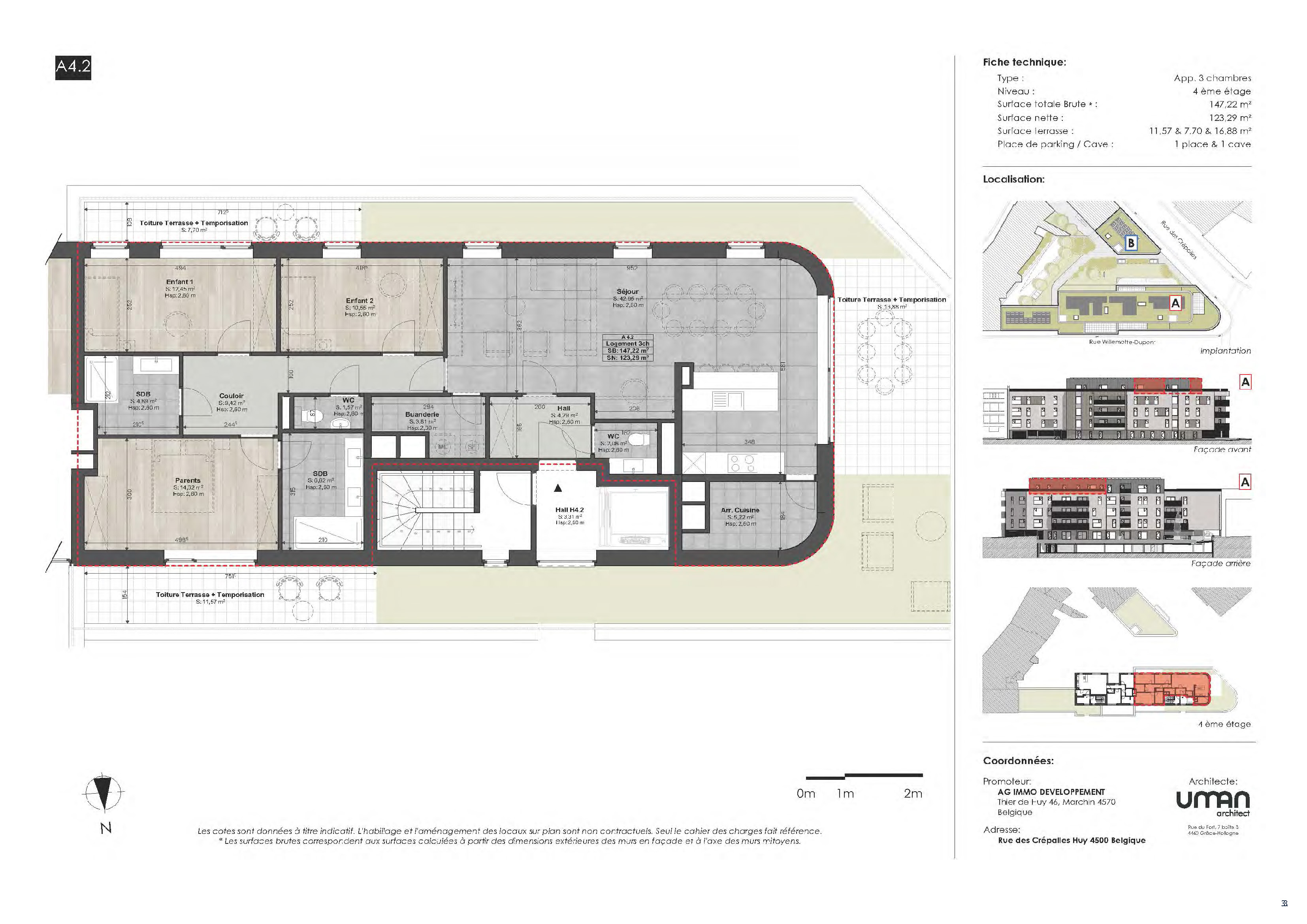 Au cœur de Huy, dans une résidence neuve de 23 appartements, l’appartement A4.2 est un appartement d’exception de 3 chambres et 147,22 m², avec une grande terrasse privative de 36,15 m². Volumes, lumière, extérieur XXL : un bien premium pour ceux qui veulent l’espace d’une maison, avec la facilité d’un appartement neuf en ville.